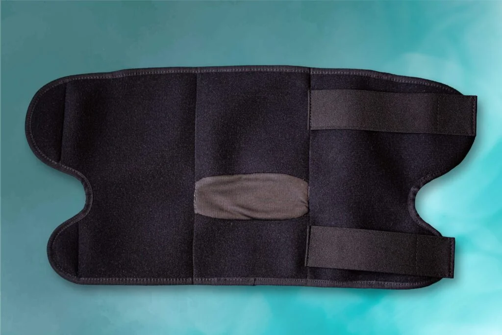 Gel packs are worn inside the custom designed bamboo charcoal fabric sleeves sewn inside the compression wrap. This liner is silky soft, wicks moisture, and has antimicrobial features.